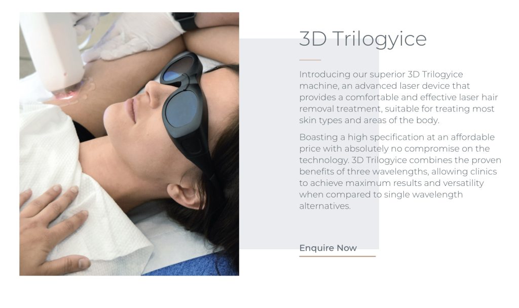 Laser hair removal has been extensively researched and clinically proven as a highly effective treatment to permanently reduce hair growth. Using the ‘Power of Three’ 3D TRILOGY ICE is the latest advance in laser hair removal technology available in the UK. The system combines the proven benefits of three wavelengths, achieving maximum results and versatility when compared to single wavelength.